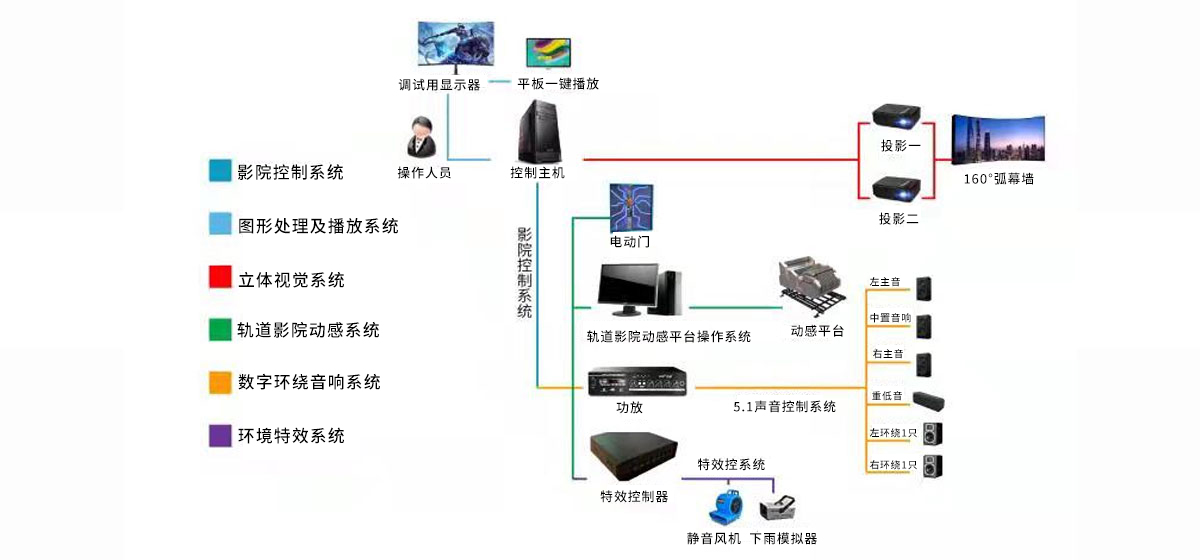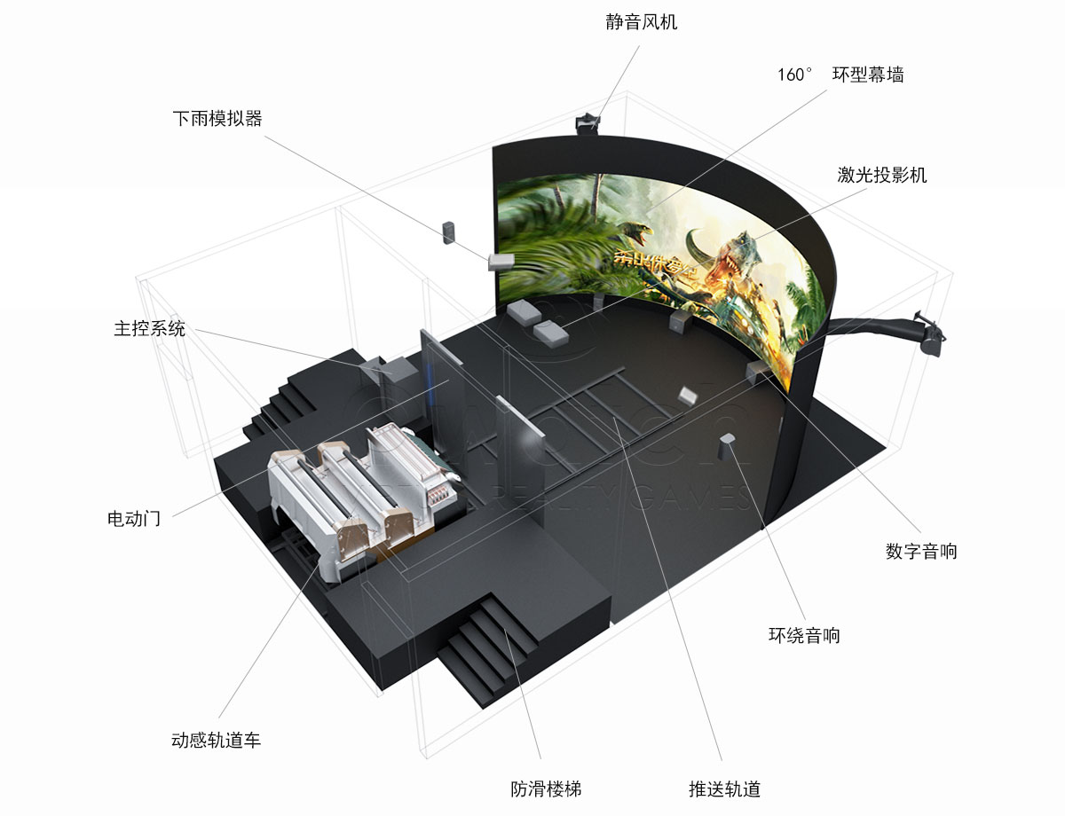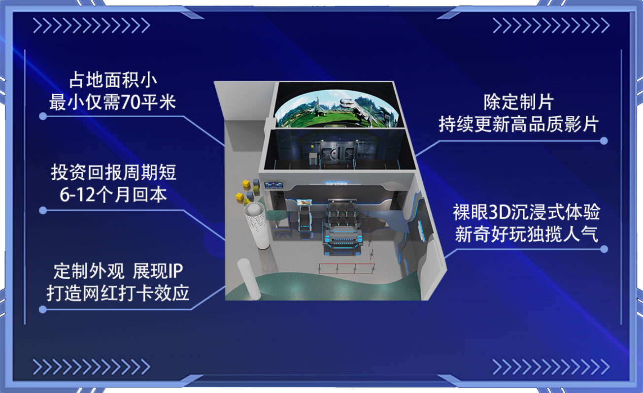 阿哩樂裸眼3D穿越軌道影院采用了環球影城和迪士尼主要應用的環幕技術,具有浸入式裸眼3D效果,是目前全球領先的特種電影技術,在國內非常少見。我們不僅高品質完美呈現了這項技術,而且創造性的小型化以適應所有的室內場所,同時把成本降到可承受的范圍內,能夠廣泛普及這項游樂應用,影片播放時,飛行動感平臺配合影片做出俯沖,搖晃等動作,提供真實刺激的飛行體驗。屏幕上的超長跨度的廣闊畫面充滿觀賞者的視野,全方位立體聲與影片情節相輔相成、完美配合,演繹精彩絕倫的沉浸式視聽享受。