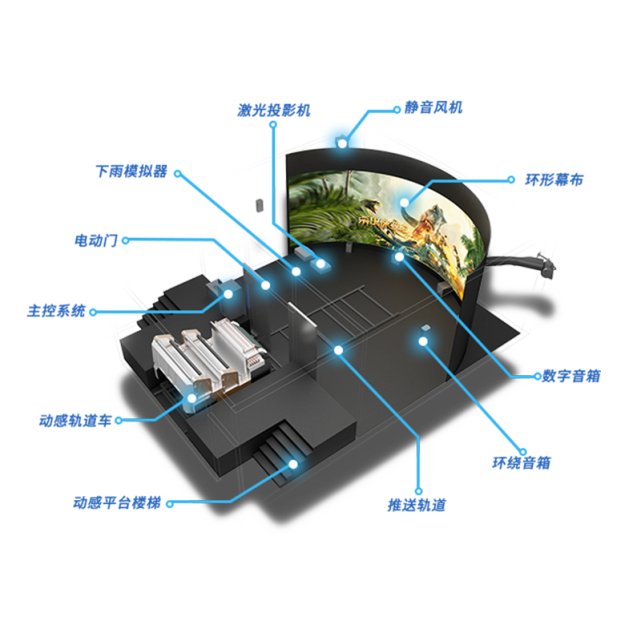 軌道影院環幕弧度有多種選擇,環形幕半徑通常有270弧度,還可根據場地具體情況進行個性化設計和施工,保證影院效果。